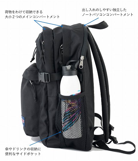 荷物の多い方でも安心な、大型・大容量リュック。大きく開いて出し入れがしやすいメインコンパートメントを含む3気室構造に、便利なポケットを複数装備しているので、たくさんの荷物を収納できるのはもちろん、散らかりがちなバッグの中身もすっきり整理整頓できます。 さらに側面には、荷物の多さに合わせてバッグを圧縮できるコンプレッションストラップもついているので、通勤通学から、旅行、アウトドアなど幅広いシーンで活躍してくれます。